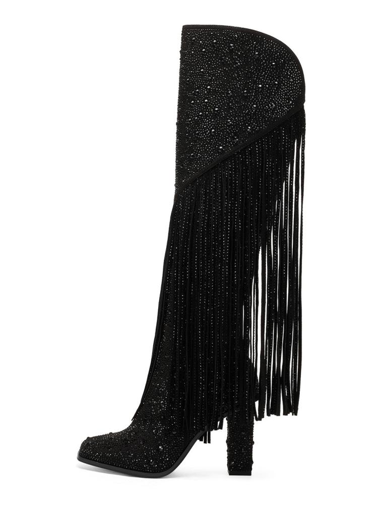 Black Rhinestone Fringe Block Heeled Knee High Tall Boots With Zip Square Toe Wide Calf