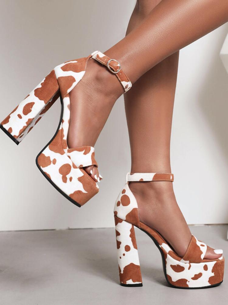 Cow Print Round Toe Block Heeled Sandals With Ankle Strap Platform