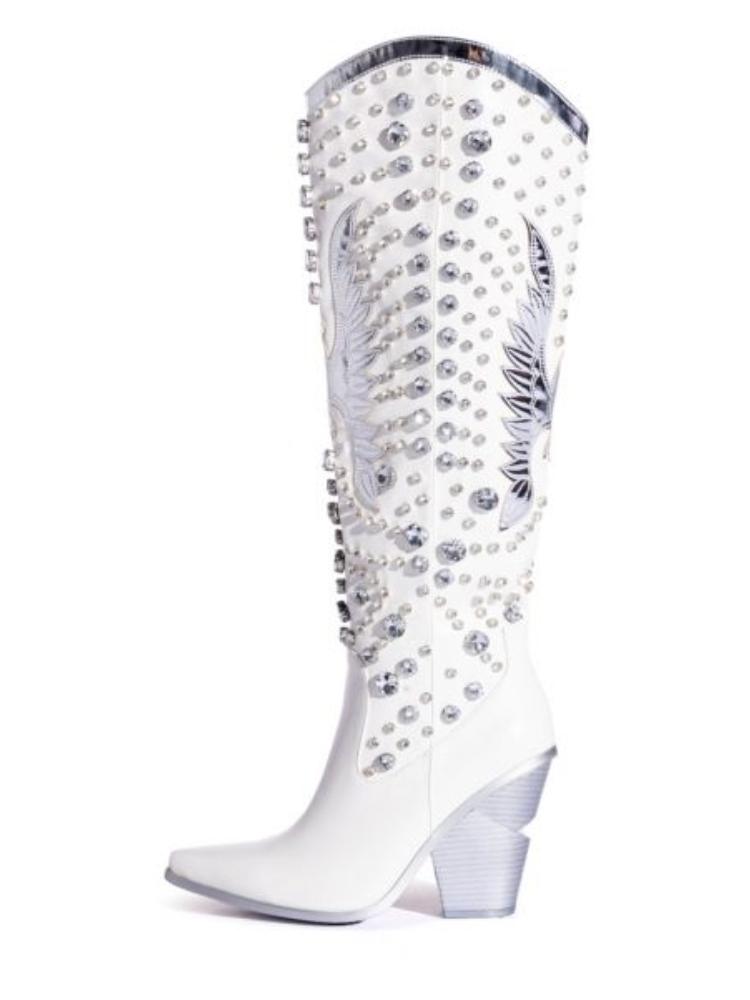 Eagle Rhinestone Zip Pointy Block Cut-Out Heel Western Cowgirl Mid Calf Boots