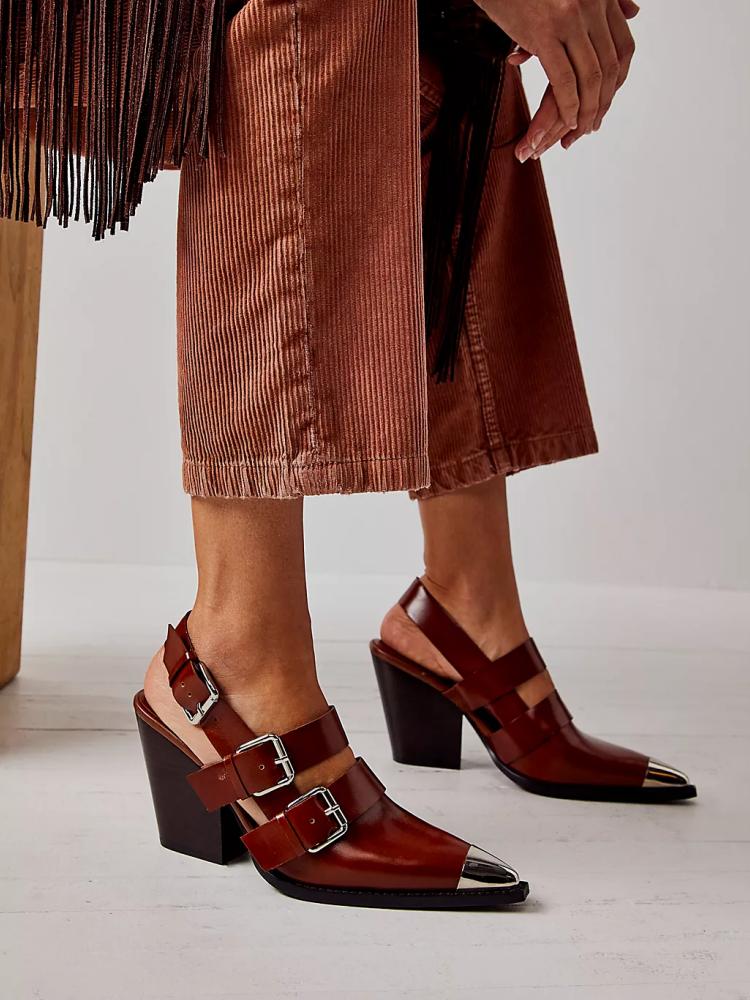 Metal Pointy Toe Triple Buckle Western Chunky Heeled Slingback Pumps