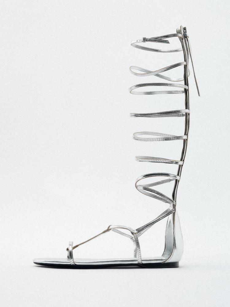 Metallic Silver Back Zip Round Toe Tall Flat Gladiator Sandals