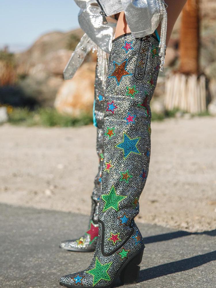 Wow, check out these fully embellished western over-the-knee boots! They are covered in sparkling rhinestones in a vintage-inspired star pattern in green, red. pink, yellow, blue, and so on. The color combination is bold and eye-catching, and the boots are guaranteed to add some serious bling to any outfit. These boots are perfect for anyone looking to make a statement and stand out from the crowd, and are sure to turn heads wherever you go!
