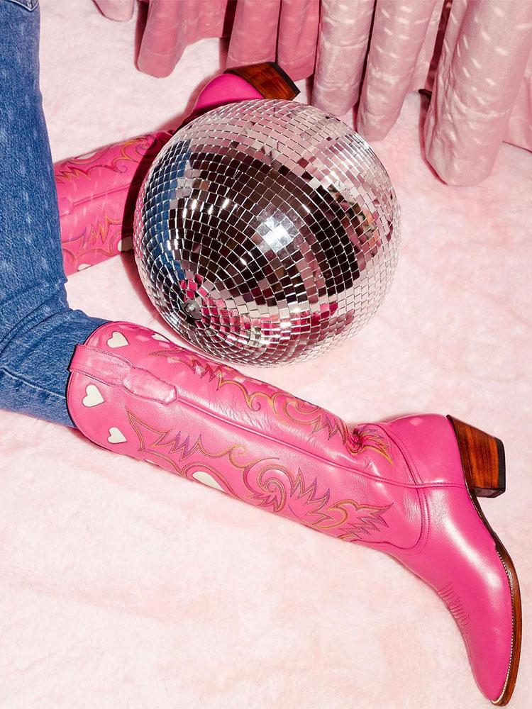 Experience a touch of girly chic with our knee high boots accented with the golden gradient embroidery, unique magenta pink, and charming white inlay heart.