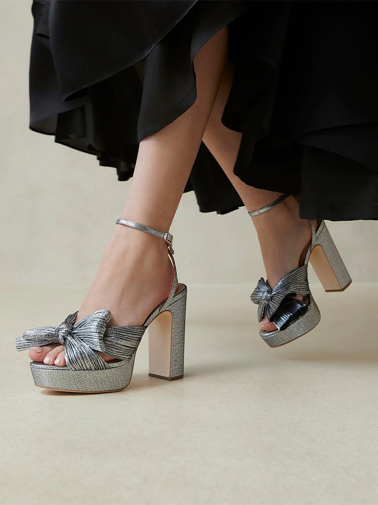 Pleated heeled platform sandal in metallic silver or white topped with our signature knotted bow. Padded raised footbed with chunky heel. Open toe with adjustable buckle ankle strap. This sandal is a truly exquisite masterpiece.