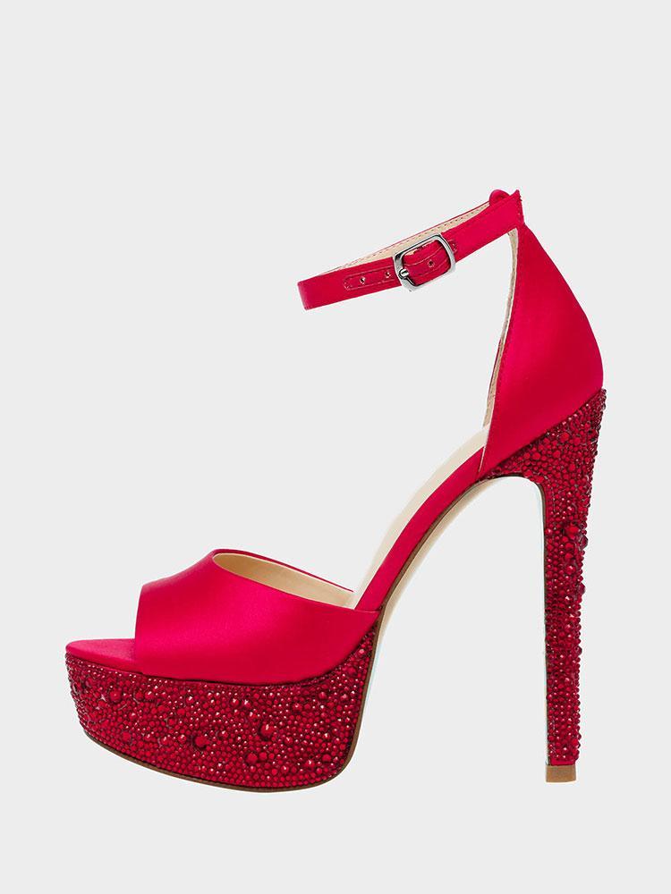 The bright red satin textile upper material, paired with a rhinestone-covered heel and platform, gives the entire shoe a confident, independent, and sexy aura.