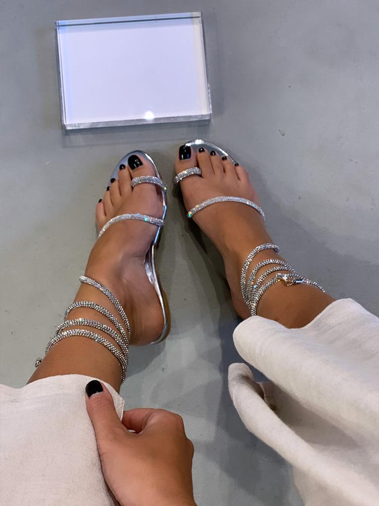 Introducing these stylish flat sandals featuring a rhinestone ankle wraparound strap, adorned with a chic lobster clasp. The sandals also boast a trendy toe ring, making them a perfect choice for fashionable summer outings. Step out in comfort and style with this stunning pair of flat sandals.