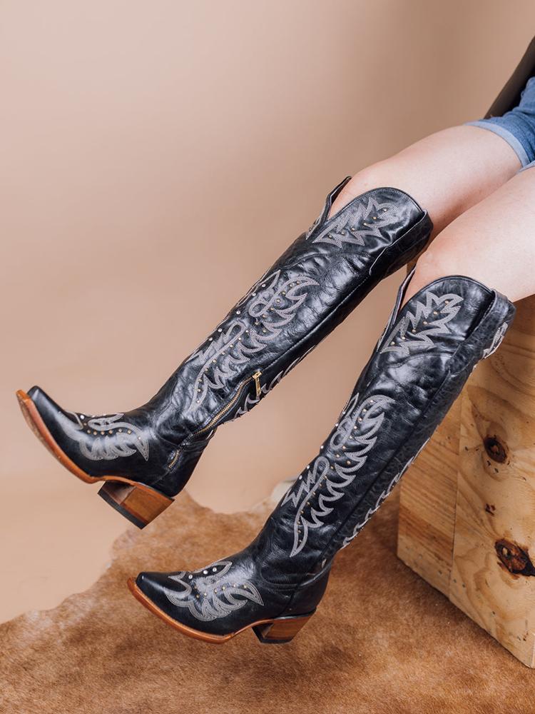 These versatile black cowgirl boots feature a striking contrast of white embroidered details, rhinestones and studs, creating a perfect design. With a snip toe and an inner zipper for easy wear, these mid-calf boots are both stylish and convenient. Crafted from vegan leather, they are not only fashionable but also durable. A must-have addition to any Western-inspired outfit.