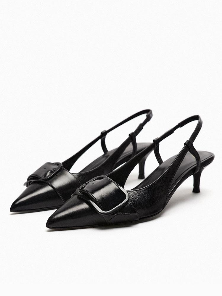 Step out in style with these elegant oil black pumps featuring a comfortable kitten heel, and an elastic strap slingback design. The pointed toe is decorated with a buckle, adding a sense of sophistication. Whether for work or play, these pumps are a versatile addition to any wardrobe.