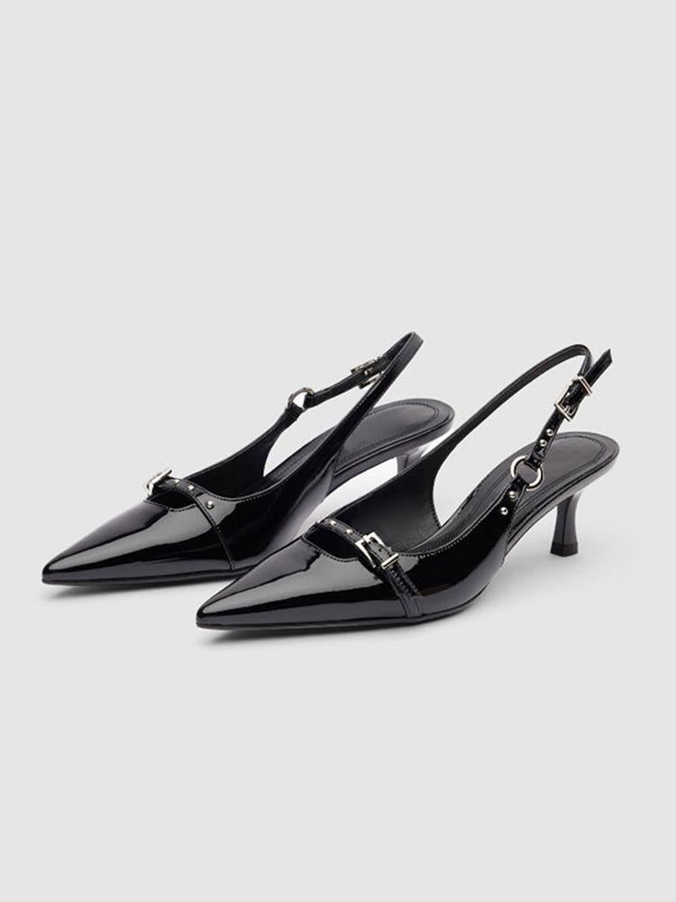 The patent vegan leather adds a glossy and polished finish to the pumps. There are two buckled straps decorated with studs, one on the heel, the other on the instep. With a kitten heel, these pumps are perfect for the spring season.