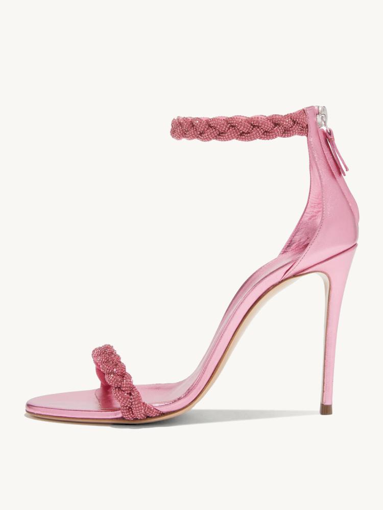 In a pink hue, the Heeled Sandal features a metallic bright surface and rhinestone-studded braided straps. Complete with a round toe, a stiletto heel, an ankle strap, and a back-zip closure.