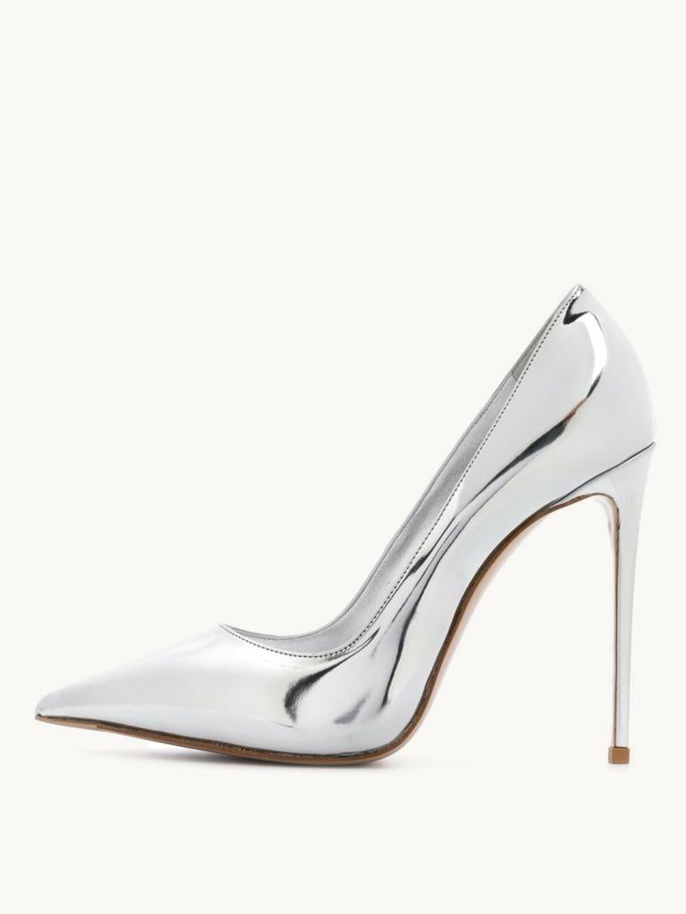 Level up your wardrobe with the pump designed to streamline and elevate any outfit. The upper is made of soft metallic silver synthetic leather. The 12 cm stiletto heel and pointed silhouette complete this luxury shoe.