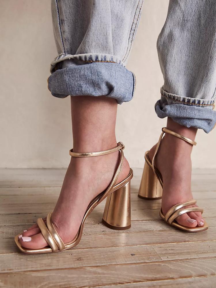 Metallic Strappy Square Toe Block Heeled Sandals With Buckled Ankle Strap