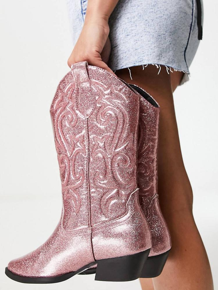 Looking for the perfect boots to complete your cowgirl look? Check out our Cowgirl Wide Mid Calf Boots. The glitter material is coated with a film, giving it a smooth and quality appearance. The addition of a pink design and classic western-inspired embroidery creates a sweet and sparkling look that perfectly embodies Western style. Order yours today and step out in style!