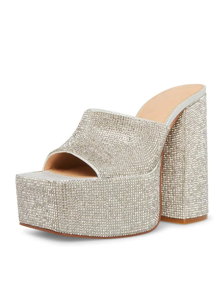 Rhinestone Square Toe Platform Chunky Heel Sandals