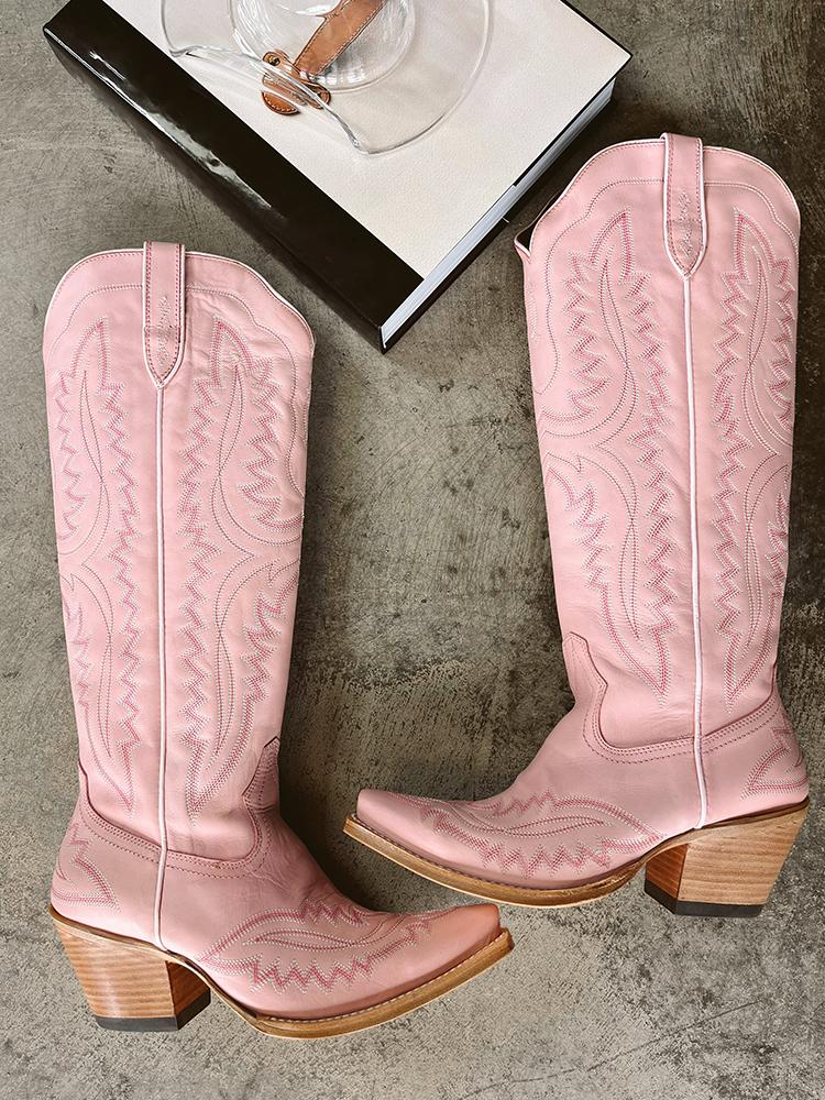 Introducing a pair of adorable mid-calf western boots, featuring a classic embroidered pattern on the ivory and pink vegan leather. These boots are perfect for anyone who wants to add a touch of sweetness to their western style. With their cute and charming design, they're sure to turn heads wherever you go.